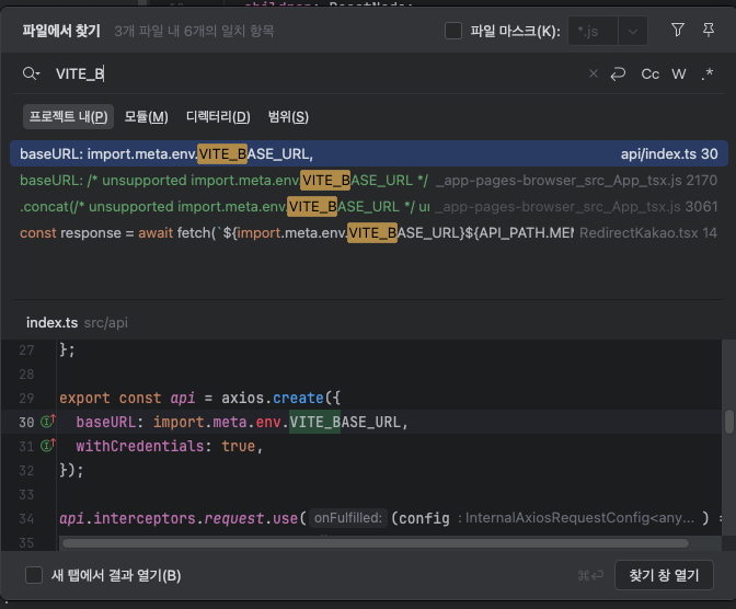 이렇게 파일에서 찾기로, 쓰고 있는 부분을 수정해주었습니다.