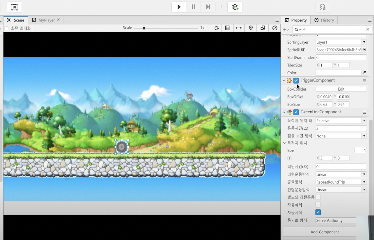 이렇게 tweenlinecomponent 를 설정해주면 톱니바퀴가 선형운동을 하고, 유저의 몸이 닿을 때마다 밀려나는 것을 구현할 수 있다.
