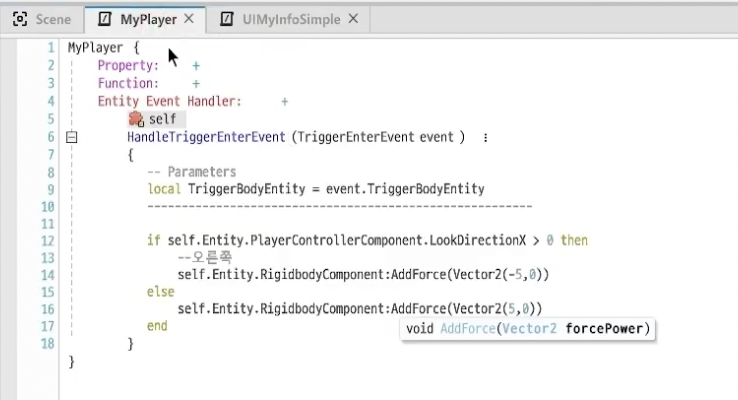 위 HandleTriggerEnterEvent 함수는 장애물과의 충돌이 들어오는 시점에서 호출되는 함수입니다. 함수의 매개변수로 TriggerEnterEvent 이벤트를 받아온 뒤, 함수 내부에서 수행할 명령어를 입력해줍니다.