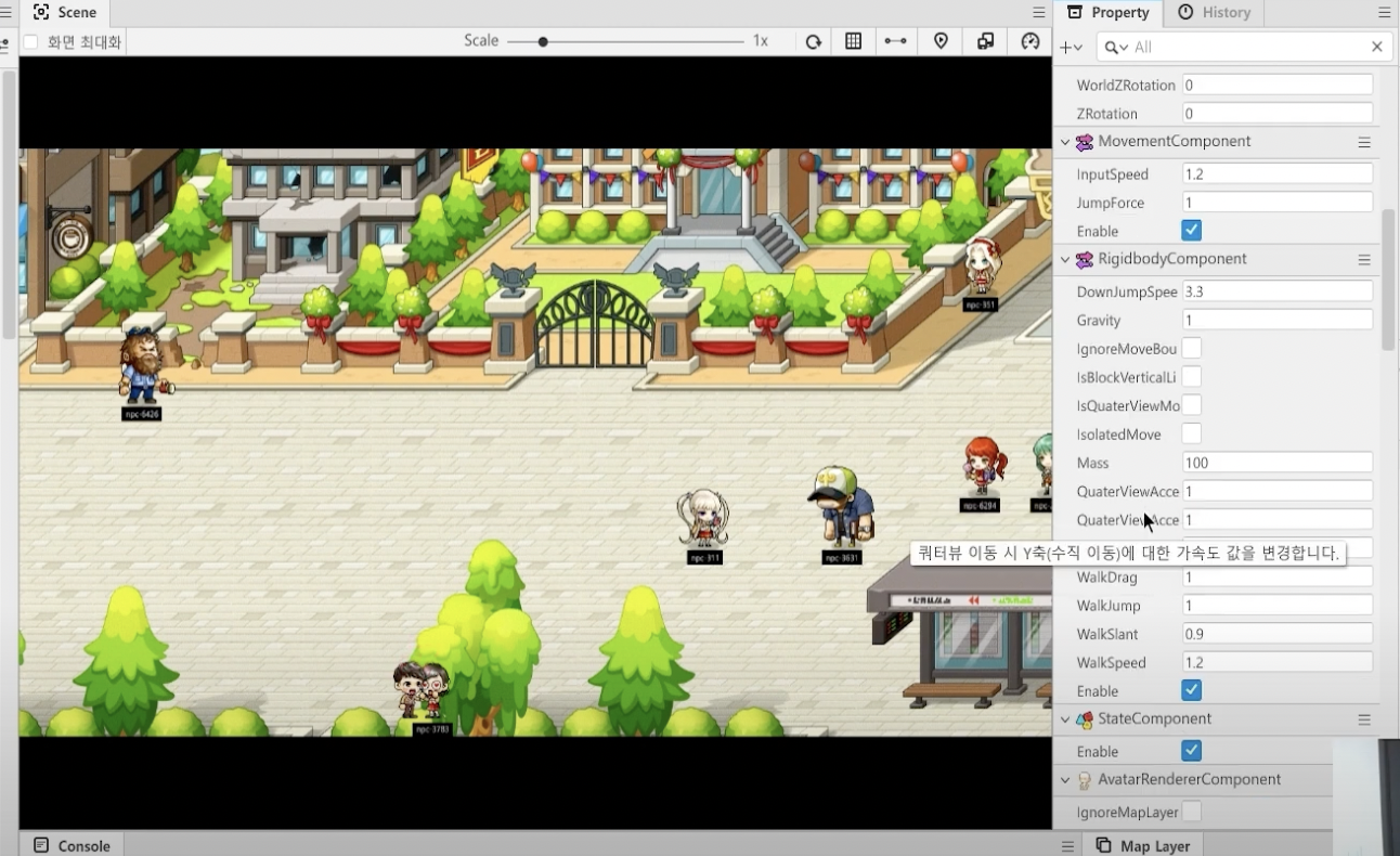 - IsQuaterViewMove : 프로퍼티의 값 조정을 통해 컴포넌트가 지형에 떨어지지 않고 자유롭게 움직일 수 있도록 설정할 수 있습니다. -> 사진에서 보는 것과 같은 앱에서는 이것을 설정해 놓아야 한다.